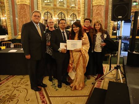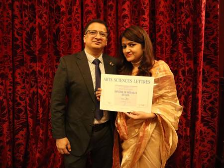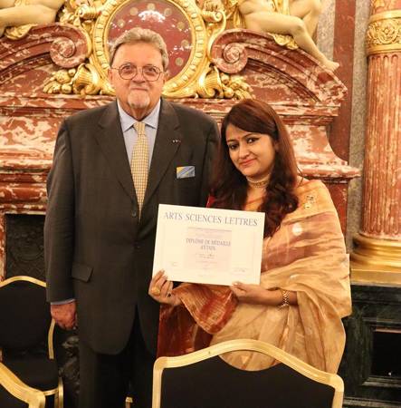 Paris, October 6, 2024 – Renowned Indian artist Swati Ghosh was honored with the prestigious ‘Diplôme de Médaille des États’ at a grand ceremony in Paris, France, organized by the Arts-Sciences-Lettres Society. Founded in 1915 by René Flament, this esteemed academic society recognizes individuals who have made significant contributions in the fields of art, literature, and science. The society operates under the patronage of the President of the French Republic and aims to encourage talent and contributions across cultural domains.